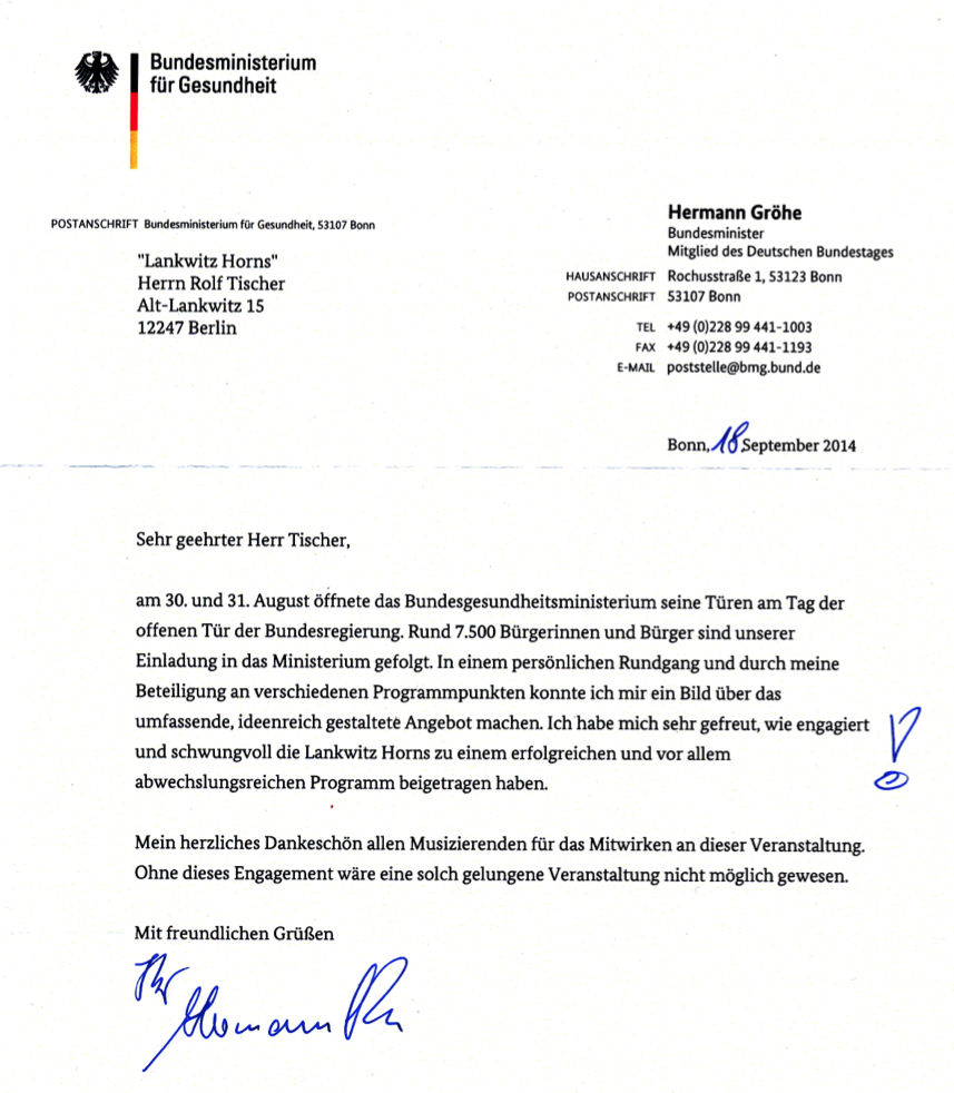 Die Lankwitz Horns haben zum Rahmenprogramm am Tag der offenen Tür im BMG beigetragen. Direkt am Friedrichstadtpalast haben wir die Besucher mit unserer Musik angelockt. Wir waren begeistert und Minister Gröhe offensichtlich auch.