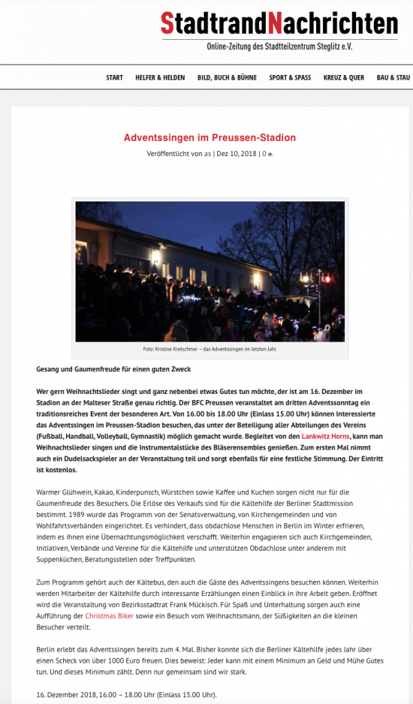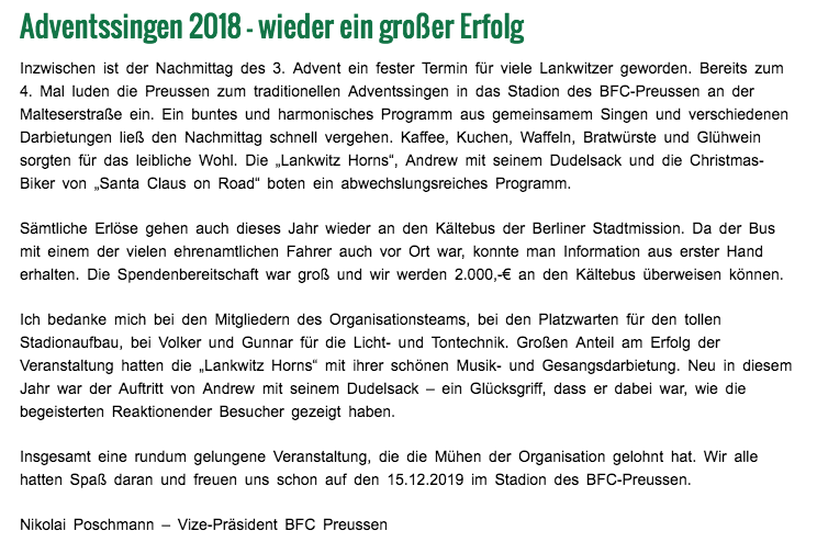 Im Vereinsblatt schreibt Nikolai Poschmann, Vize-Präsident des BFC-Preussen über unser traditionelles Weihnachtskonzert: